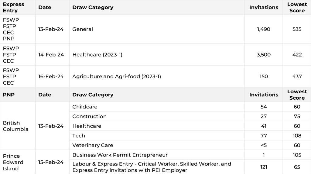 - Alberta Opportunity Stream Intake Pause: The Alberta Advantage Immigration Program announced a temporary halt to Alberta Opportunity Stream applications as of February 15, 2024, to better manage existing applications and focus on nominations that address labour shortages in critical areas such as healthcare, technology, construction, agriculture, tourism, and hospitality. The AAIP will continue processing applications received prior to the pause, but draft applications in the portal awaiting fee payment will not be processed. Read more