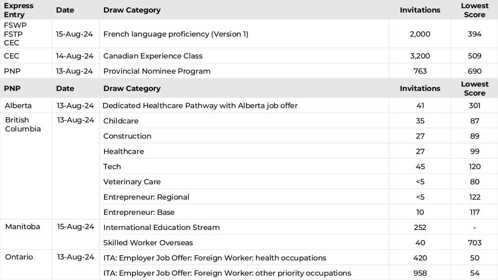 - New Brunswick Express Entry ITA Pause: Effective August 16, 2024, the issuance of new Invitations to Apply (ITAs) under the New Brunswick Express Entry stream is paused for the remainder of the year, as the full 2024 allocation has been reached. Applications fully submitted before this date will continue to be processed, and candidates who received an ITA prior to August 16, 2024, may still submit their full nomination applications. Read more