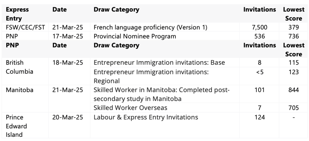 - Canada invests $9.3M in Francophone minority communities: On March 20, 2025, the federal government announced funding for 12 projects under the Francophone Immigration Support Program to promote economic development and demographic growth in Francophone minority communities. The initiatives, led by the Centre for Innovation in Francophone Immigration, aim to improve recruitment, selection, and settlement of French-speaking applicants and support their pathway to permanent residence. Targets for French-speaking permanent residents outside Quebec will rise to 8.5% in 2025, 9.5% in 2026, and 10% in 2027. Read more