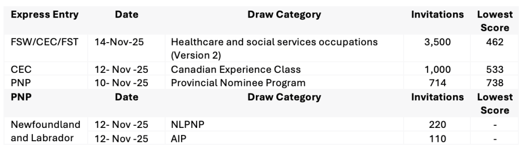 - Ontario – Express Entry: Skilled Trades Stream Suspension – November 14, 2025: Ontario suspended intake for the Skilled Trades Stream after identifying systemic misrepresentation and fraud risks, will return all outstanding applications with fee refunds, and advises interested applicants to submit a new EOI under other eligible OINP streams. Read more