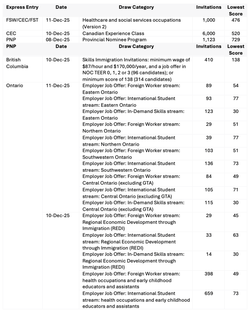 - Targeted Immigration Measures – Doctors – December 8, 2025: IRCC announced a new Express Entry category for international doctors with at least one year of recent Canadian work experience, 5,000 additional federal admission spaces for provincial and territorial nominations of licensed doctors with job offers, and expedited 14-day work permit processing, with invitations expected in early 2026. Read more