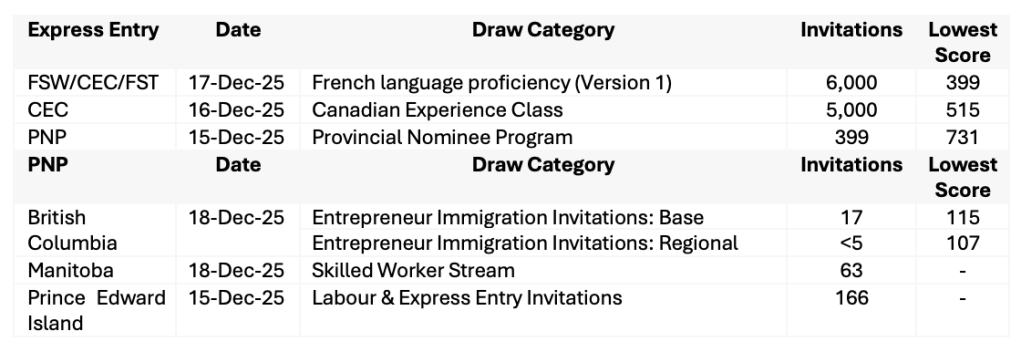 - British Columbia PNP 2025 Final Nomination Allocation – December 15, 2025: British Columbia received an additional 960 nominations, bringing the BC PNP’s 2025 allocation to 6,214. Nominations are applied to priority groups, including healthcare, entrepreneurs, high economic impact candidates, and some waitlisted International Post-Graduate applications, with the full allocation to be used by December 31, 2025. Read more