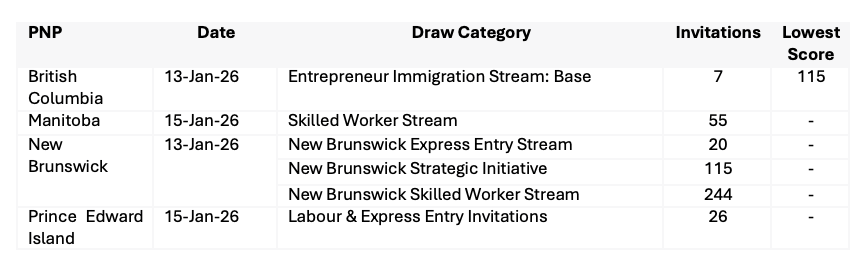 - Yukon Nominee Program – January 12, 2026: Yukon received 282 nominations for 2026 and will use a points-based Expression of Interest system with two intake periods (January 19–30; July 6–17). Priority applies to health care professionals, rural employers, and candidates with Yukon ties, including prior Yukon work, Yukon University graduation, Francophone ability, or a Temporary Measure Letter of Support issued in 2024 or 2025. Holders of Temporary Measure Letters are exempt from submitting an Expression of Interest and will be contacted directly. Read more