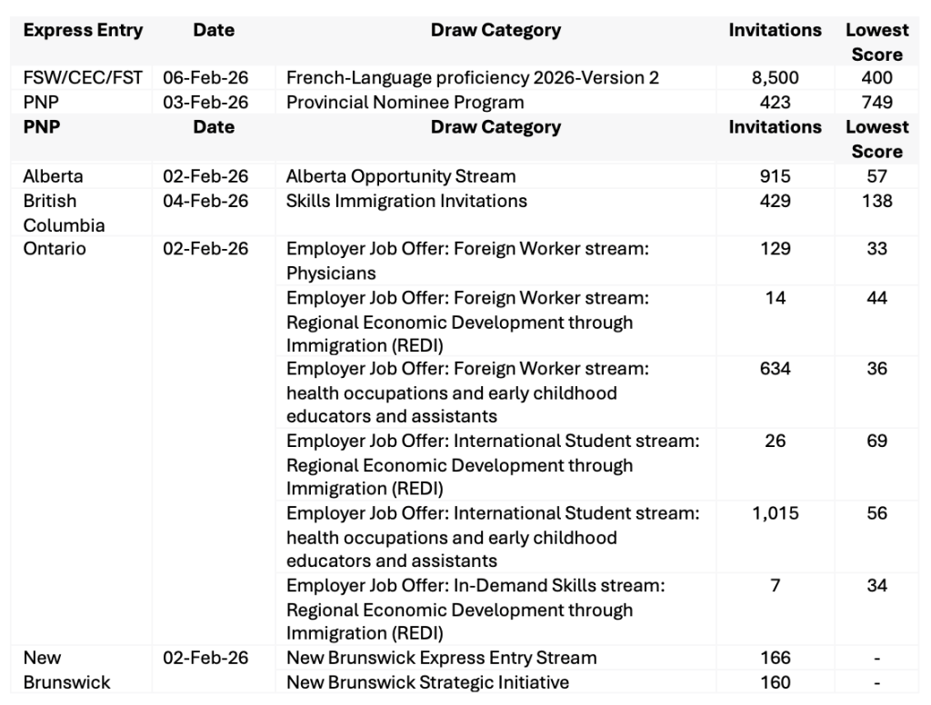 - Manitoba Provincial Nominee Program – February 5, 2026: Effective February 4, 2026, sector eligibility under the Temporary Resident Retention Pilot (TRRP) revised to reflect current labour market needs; Hospitality and Food Services removed as an eligible sector and additional skilled trades occupations added. Read more and Read more